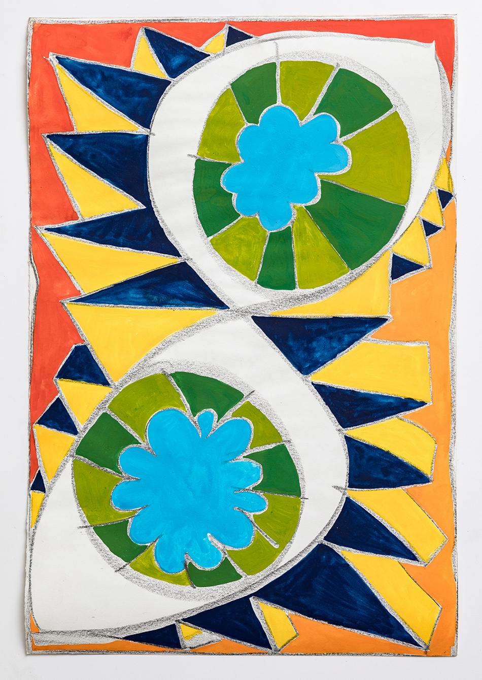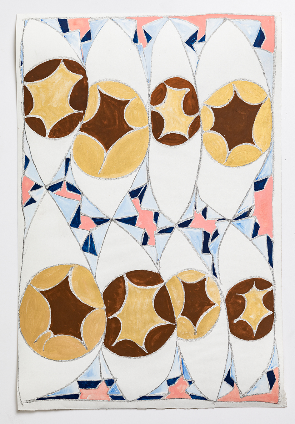 It seems that, for Huntley, the ideas underpinning his practice in part determine the materials that he uses. The gouache and graphite works obey this logic; their painterly qualities function in service of the interactions between line, colour and surface that they interrogate. In this, the works feel diagrammatic or perhaps schematic, like complex three-dimensional shapes whose surfaces have been unfurled, laid out flat for the consideration of both viewer and artist.