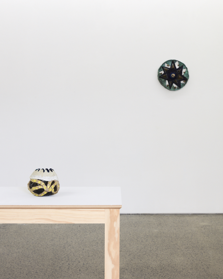 Many of the works in Over the Moon, Under the Sun contain eyes, or references to sight: globes, lenses, striations suggesting the fine patterns of the iris contracting or expanding to let in light. However, they deploy these self-reflexive gestures in different ways; the ceramic works, with their elaborate, translucent glazes that evoke gems, tree sap or standing water, emphasise a kind of looking that is introspective and trancelike, while the bronze wall works, which incorporate moulds taken from bowls and other domestic objects, evoke “distant memories of domestic vessels [that] hint at the home, the safe house,” in Huntley’s words. This is another kind of looking, the easy glance at familiar objects that can, over time, almost render them invisible.